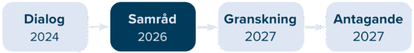 Samråd planeras till våren/sommaren 2026. Då kommer det finnas möjlighet att lämna synpunkter på förslaget till ny översiktsplan. Under 2027 planerar planförslaget ställas ut för granskning. Även då kommer det finnas möjlighet att lämna synpunkter på förslaget. Översiktsplanen beräknas kunna antas under 2027.
