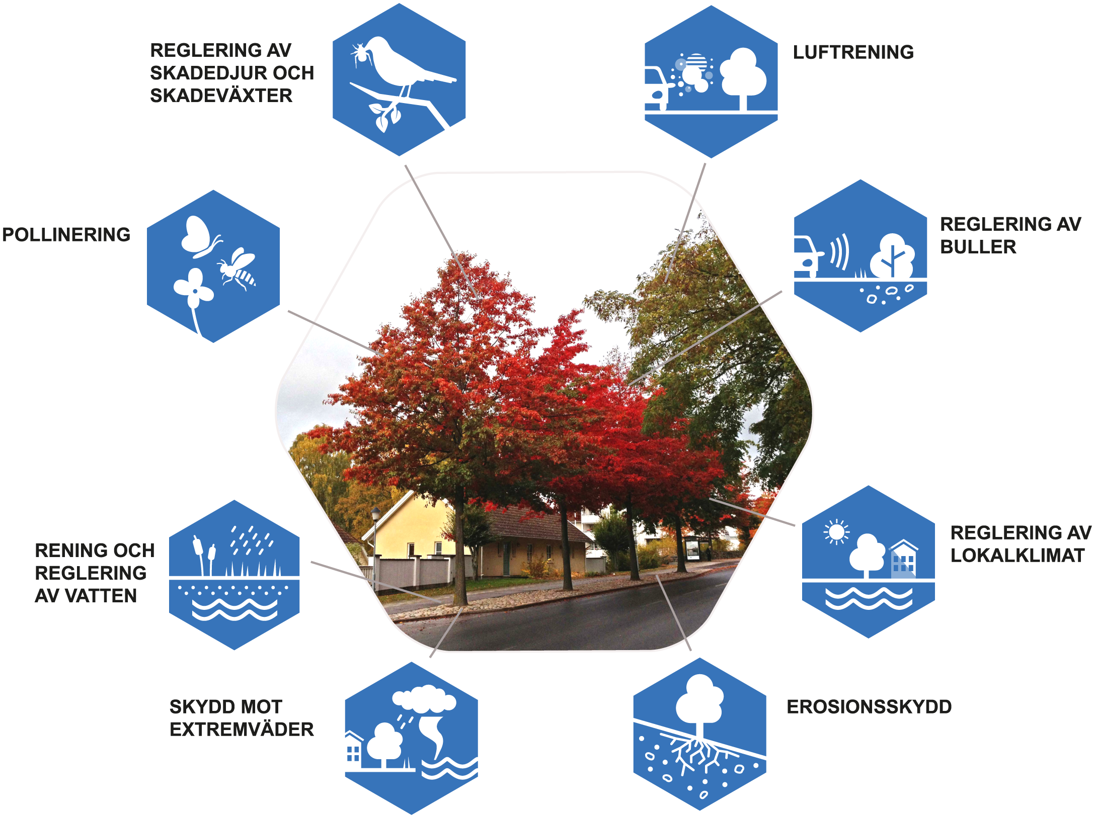Naturen har en egen styrning för att klara av vissa kritiska förlopp, som exempelvis översvämning och rening av luft. De reglerande ekosystemtjänsterna tydliggör grönskans roll i den klimatanpassning som krävs i ett föränderligt klimat. All grönska bidrar till dessa tjänster, men för att förtydliga ekotjänsternas funktion och nytta använder vi här träd som exempel.