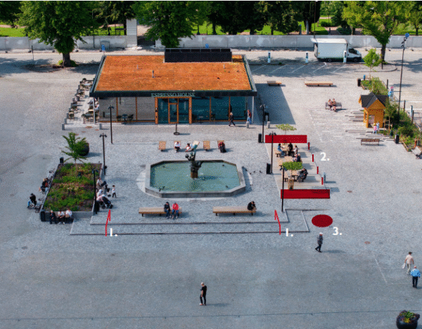 Åtgärder som kommer att vidtas på Stortorget är 1. Räcken sätts upp vid trappstegen 2. Avgränsningar sätts upp vid trädäcket 3. En urna för mer grönska placeras ut i hörnan mellan trappsteg och trädäck. Bild: Sydväst arkitektur och landskap.