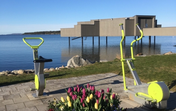 Ett mindre utegym med en motionscykel och en crosstrainer som genererar energi så att du samtidigt kan ladda din telefon om du vill. Ta med ladd-sladd.